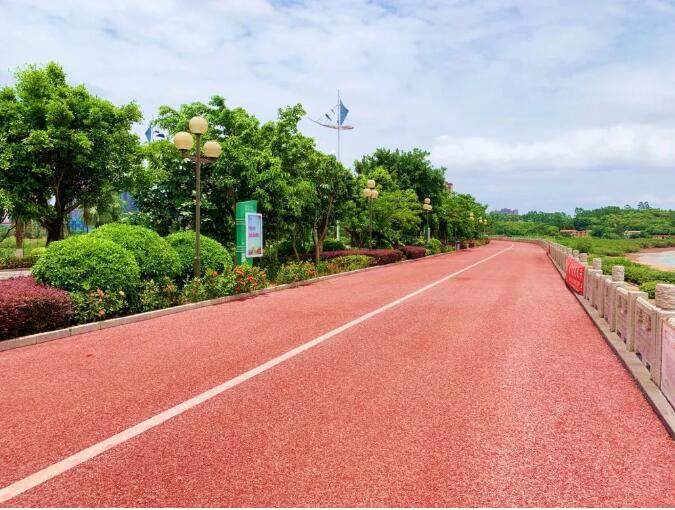 绿道主要是透水沥青的结构,包含了3cm的应力吸收层和3cm的沥青找平层,最后面层才是6cm厚的红色透水沥青层,排水坡度设计为1.5%。其中依靠自粘式玻璃纤维格栅来防止原路面的反射裂缝,通过热沥青油来对各层进行粘合。